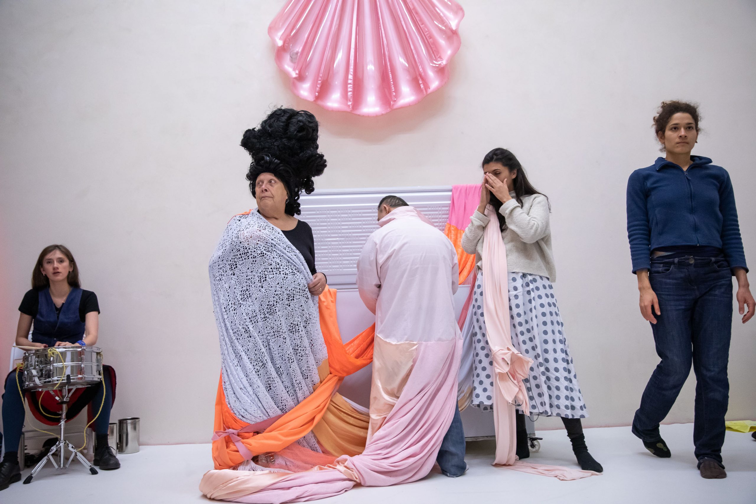 Group of people performing individually and together in a large room